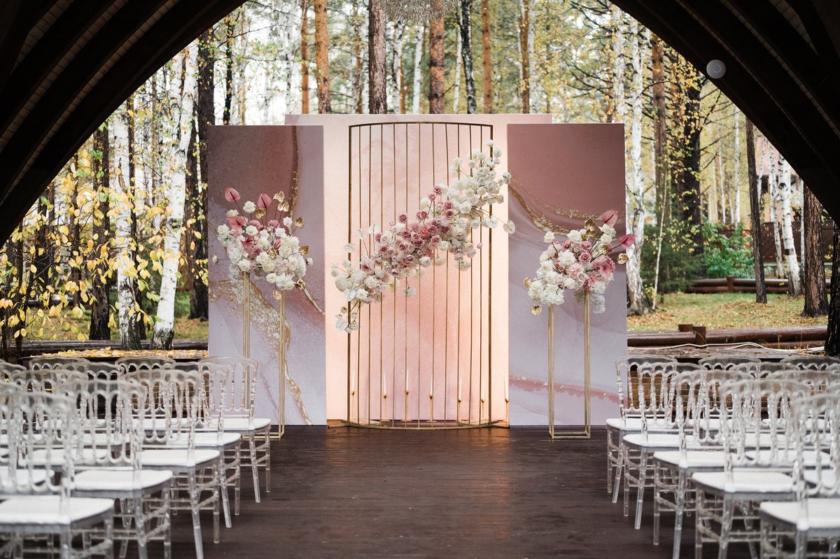 Важными элементами декора выездной церемонии являются красивые стулья для гостей, декорированный столик для регистратора, дорожка, могут быть использованы стойки с цветочными композициями, которые подчеркнут изящество торжества.